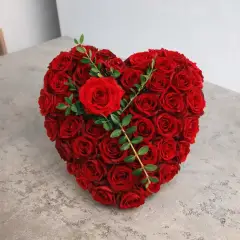 Large heart made of roses only: heart made solely from roses and green leaves, with a ribbon featuring a gold design and gold lettering (text up to 20 characters)